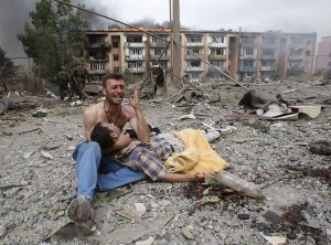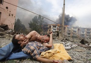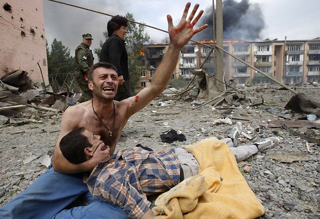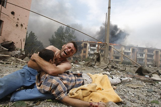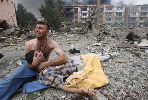 A Georgian man cries near the body of his relative after a bombardment in Gori, 80 km (50 miles) from Tbilisi, August 9, 2008. A Russian warplane dropped a bomb on an apartment block in the Georgian town of Gori on Saturday, killing at least 5 people, a Reuters reporter said. The bomb hit the five-story building in Gori close to Georgia’s embattled breakaway province of South Ossetia when Russian warplanes carried out a raid against military targets around the town. REUTERS/Gleb Garanich (GEORGIA)