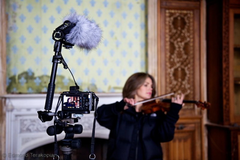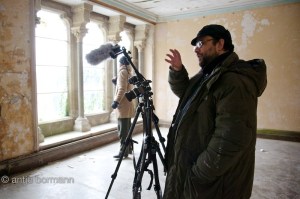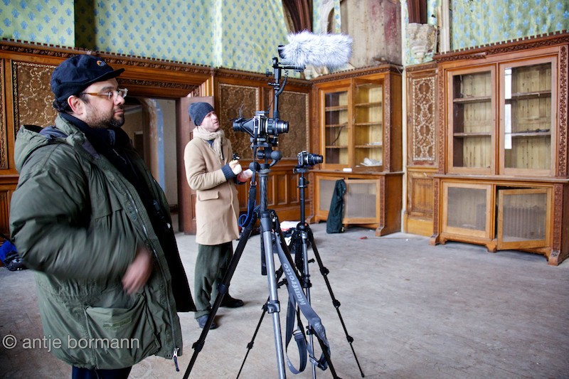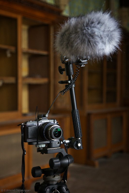 Some photographs from the filming of Homage, showing the Olympus E-P2s in action. The microphone is the Rode VideoMic with a Rode “Dead cat” attached and mounted on a Manfrotto flash bracket.