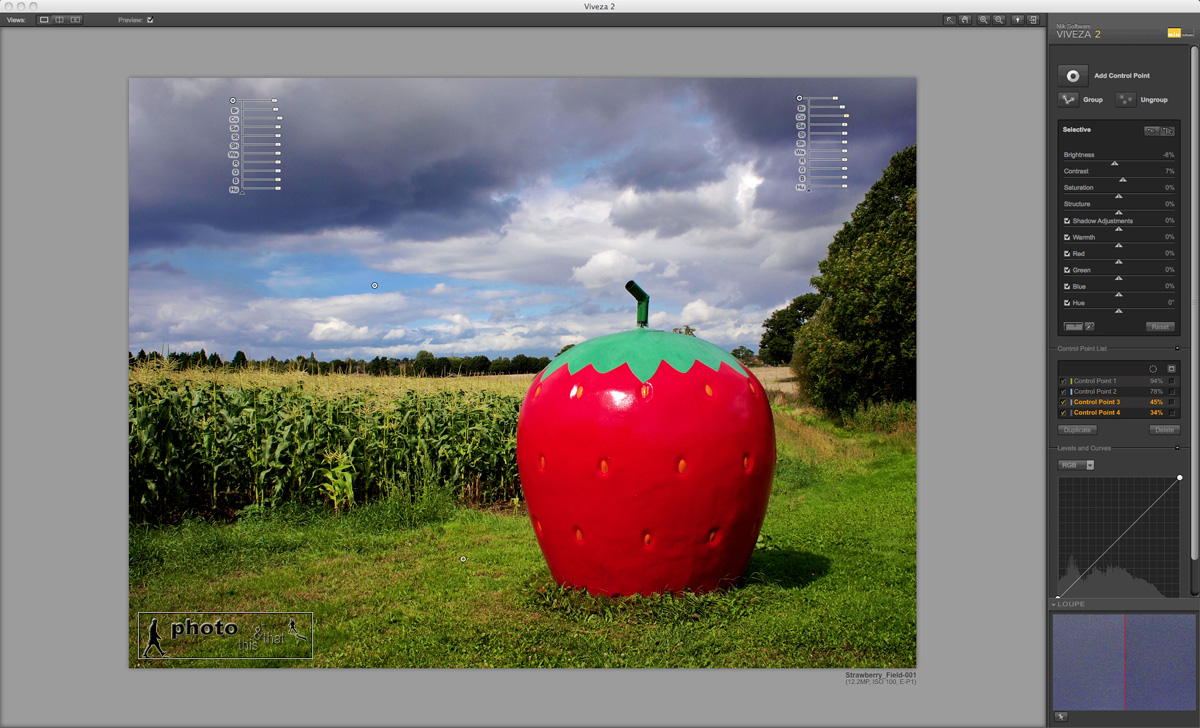Viveza 2 plug-in window, showing the version for Apple’s Aperture. I have two Control Points in the grey portions of the sky grouped together. I’ve darkened this selection and added some contrast. There is another Control Point in the blue area of the sky, where I have darkened the sky and added some saturation. The last one is in the green grass area where I’ve lightened the grass and upped the saturation a touch.