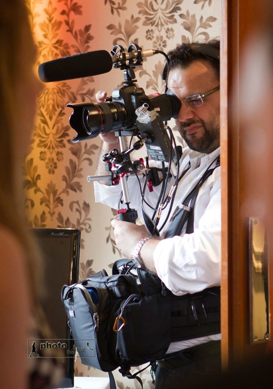 Photographer and film maker Edmond Terakopian using a Canon 5D MkII, Zacuto Striker and Z-Finder Pro x2.5, Think Tank Photo Wired Up 10 bag, Zoom H4-n and Rode NTG-3 mic The wedding of Sheleen and Ben. August 28, 2010. Photo: Jeff Ascough