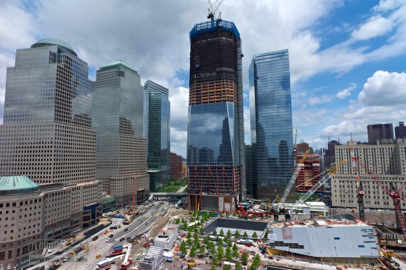 World Trade Centre Memorial Plaza, consisting of two pools with waterfalls set within the footprints of the Twin Towers. Image shows the partially completed One World Trade Centre (Freedom Tower – towards the left of the image). Construction work at the World Trade Centre, New York. May 21, 2011. Photo: Edmond Terakopian