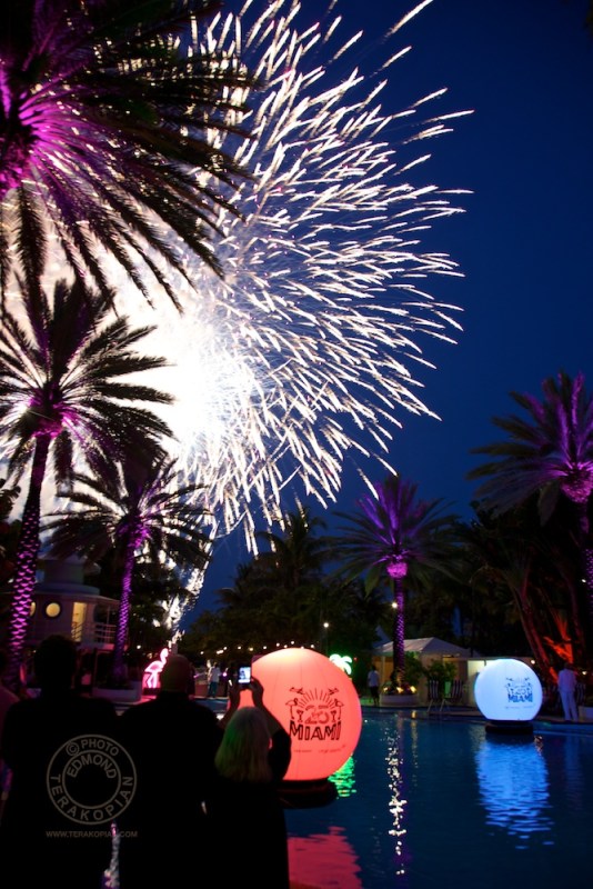 Virgin Atlantic is celebrating 25 years of flying between London and Miami with a birthday party at the Raleigh, Miami. A firework display kicks of the celebrations. Miami, Florida, USA. June 16, 2011. Photo: Edmond Terakopian