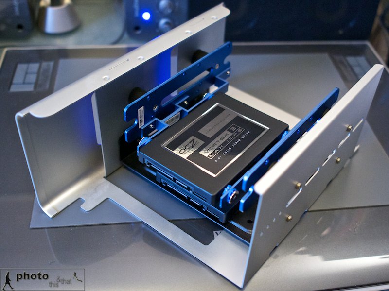 Upgrading the Mac Pro to SSDs. Both OCZ drives in their adapters, fitted to the DVD tray, ready to be installed. August 02, 2011. Photo: Edmond Terakopian