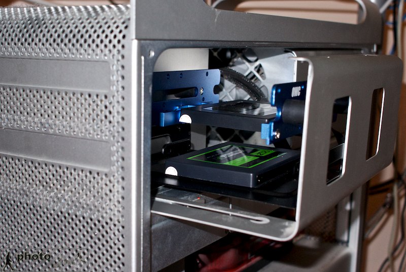 Upgrading the Mac Pro to SSDs. Both OCZ drives in their adapters, fitted to the DVD tray, being installed in the Mac Pro. August 02, 2011. Photo: Edmond Terakopian