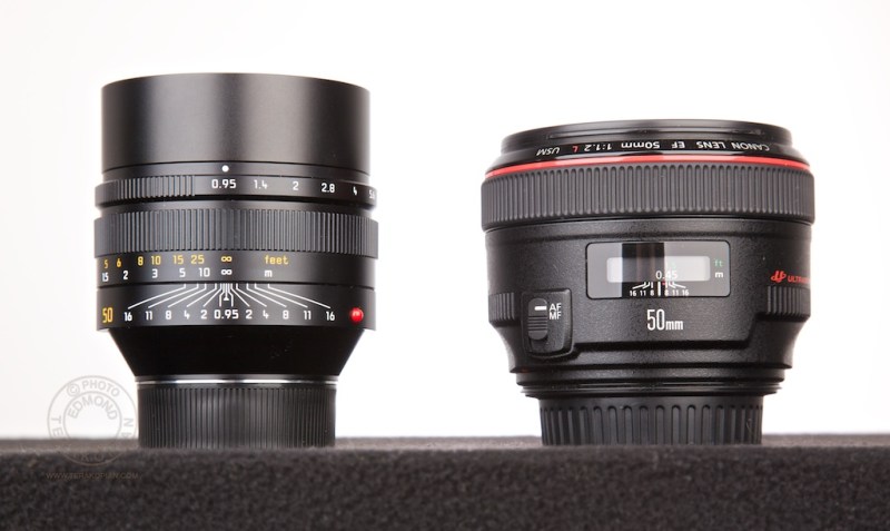 Comparison of current Leica 50mm lenses. The Leica 50 mm f/0.95 Noctilux-M and for size comparison a Canon EF 50mm f/1.2L USM lens. April 01, 2011. Photo: Edmond Terakopian