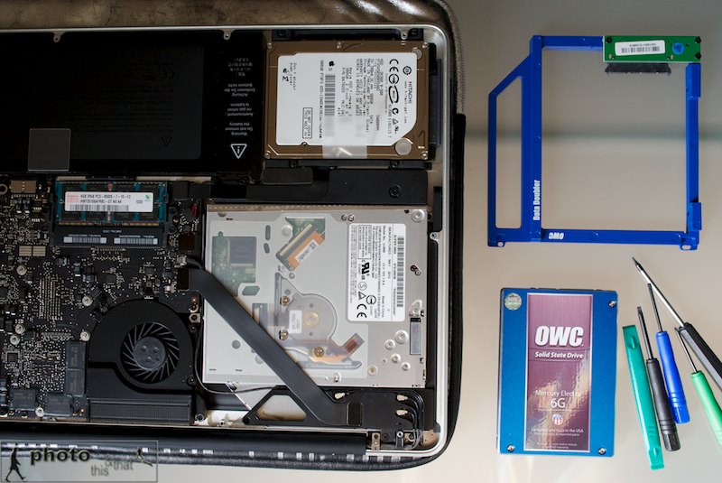 Installing an OWC Mercury Electra 6G SSD into an Apple MacBook Pro (15″, Mid 2010 model). With the cover off; the DVD drive where the SSD will be installed is on the bottom left. The OWC “Data Doubler” bracket, SSD and the tools needed for the job. August 22, 2011. Photo: Edmond Terakopian