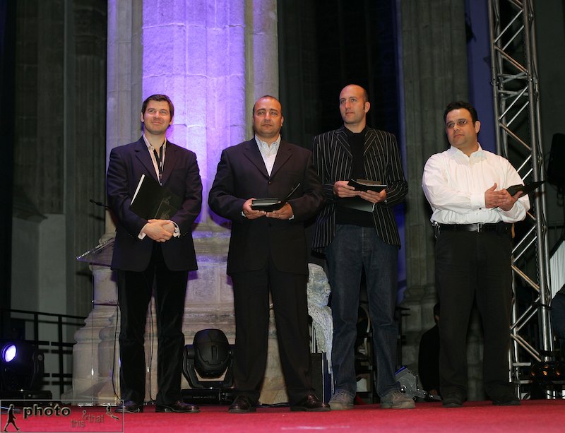 World Press Photo in de Oude Kerk. Press Photographers (L-R) Chris Hondros (who was sadly killed on assignment in Libya, 2011), Mohamad Azakir, Ben Smith and Edmond Terakopian with their awards for the Spot News and Spot News Stories categories. Photo: Bastiaan Heus