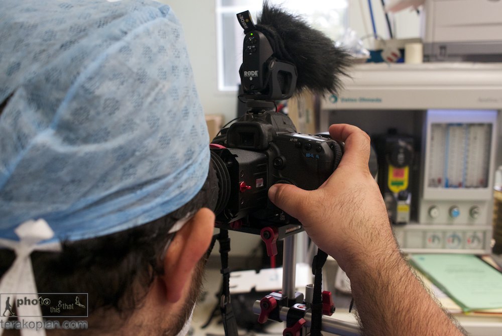 Photographer and film maker Edmond Terakopian filming at the Royal National Orthopaedic Hospital in Stanmore, with the Rode VideoMic Pro. Filming in an operating theatre. May 16, 2011. Photo: Neil patience