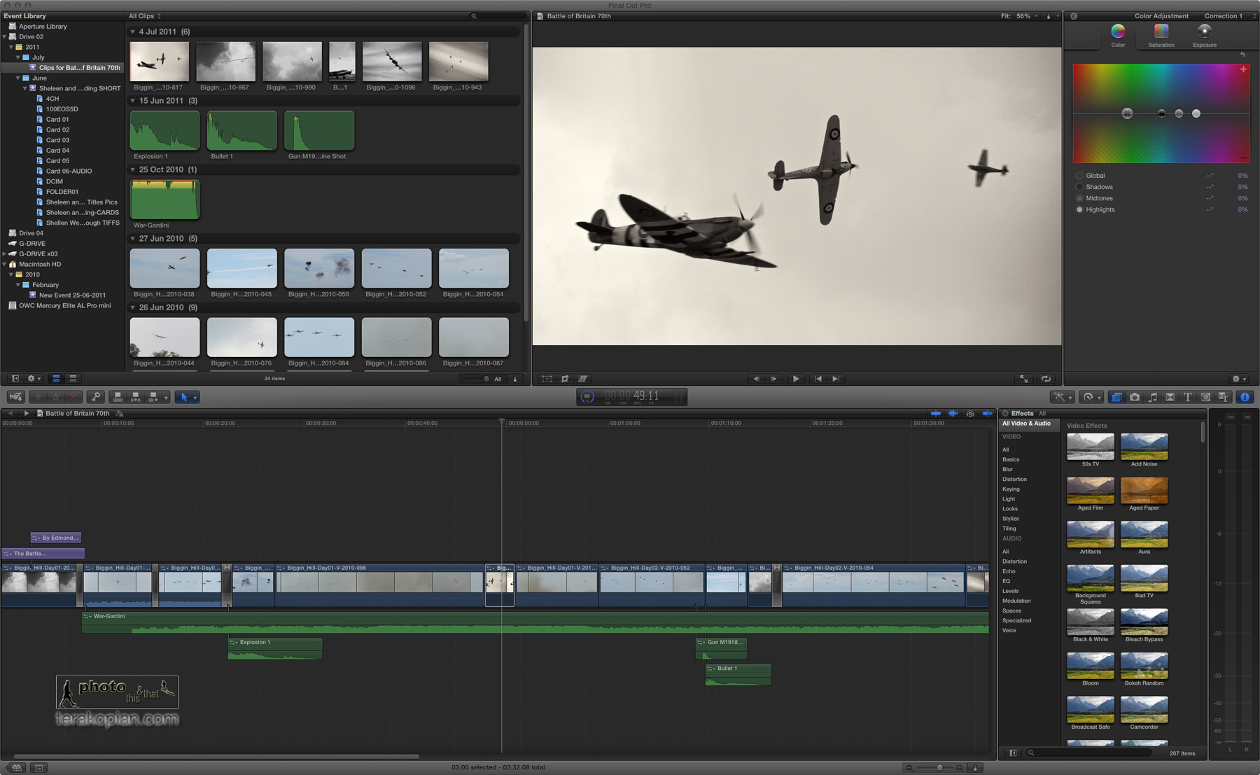 FCP X, showing the Event Library, Clips, Viewer, Inspector (Colour Adjustmnt), Timeline, Effects Browser and Audio Meters.