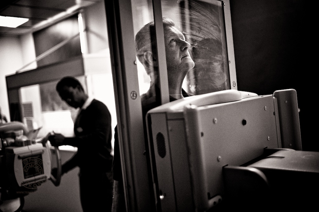 Feature on the Royal National Orthopaedic Hospital (RNOH) in Stanmore ahead of the launch of their fundraising appeal. The Imaging Department is one of the departments that will benefit from the redevelopment. Superintendant Radiographer Marubini Mamphwe carries out a Scoliosis X-Ray on patient David Chapell. February 06, 2012. Photo: Edmond Terakopian