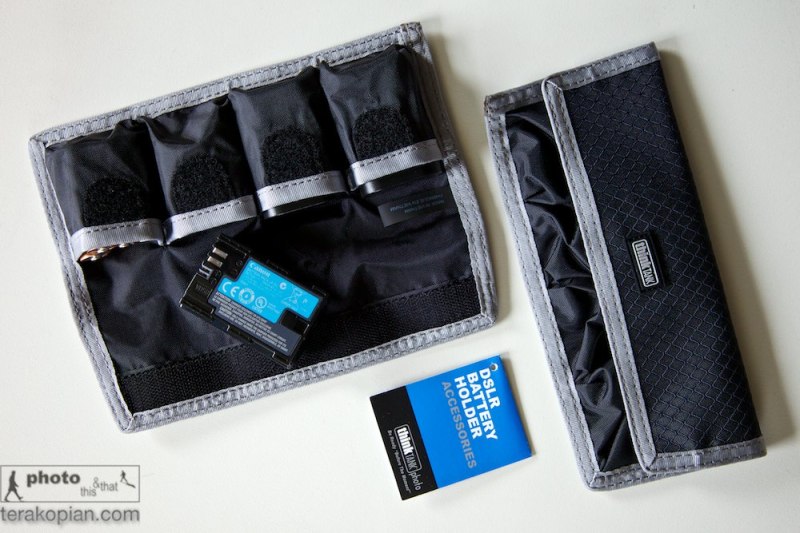 Think Tank Photo DSLR Battery Holder 4. Photographed with Canon LP-E6 (for the Canon 5D MkII, MkIII) and a set of 4 AA Batteries in one of the compartments. July 4, 2012. Photo; Edmond Terakopian