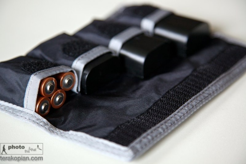 Think Tank Photo DSLR Battery Holder 4. Photographed with Canon LP-E6 (for the Canon 5D MkII, MkIII) and a set of 4 AA Batteries in one of the compartments. July 4, 2012. Photo; Edmond Terakopian