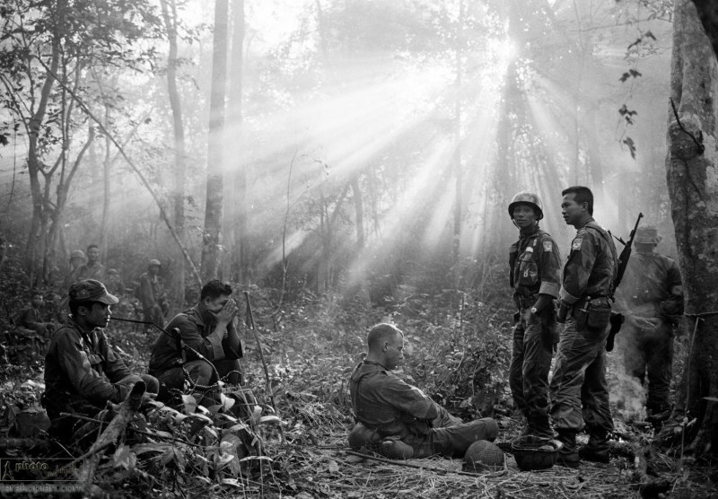 The sun breaks through dense jungle foliage in early January 1965, around the embattled town of Binh Gia, 64 km east of Saigon, as South Vietnamese troops, joined by U.S. personnel, rest after a cold, damp night of waiting in an ambush position for a Viet Cong attack that didn’t come. One hour later, as the possibility of an overnight attack faded, the troops moved out for another hot day hunting the elusive communist guerrillas. (AP Photo/Horst Faas) FOR ONE-TIME USE ONLY IN CONNECTION WITH THE AP/HORST FAAS EXHIBIT AT THE FOREIGN CORRESPONDENTS CLUB OF HONG KONG