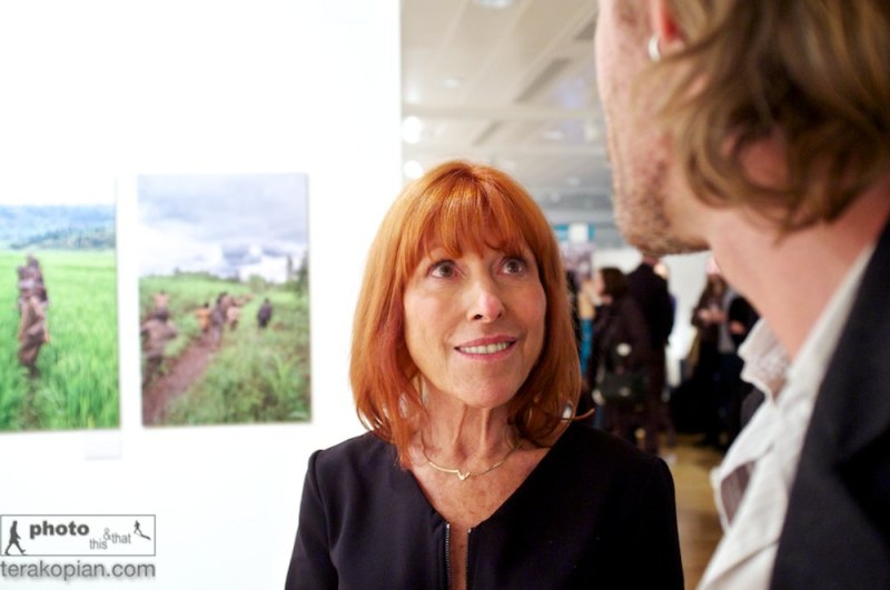 Carol Allen Storey chats with a guest at the opening. The private view of Fractured Lives by Carol Allen Storey at the SW1 Gallery, Roof Garden Level, Cardinal Place (off Victoria St), London. October 02, 2012. Photo: Edmond Terakopian