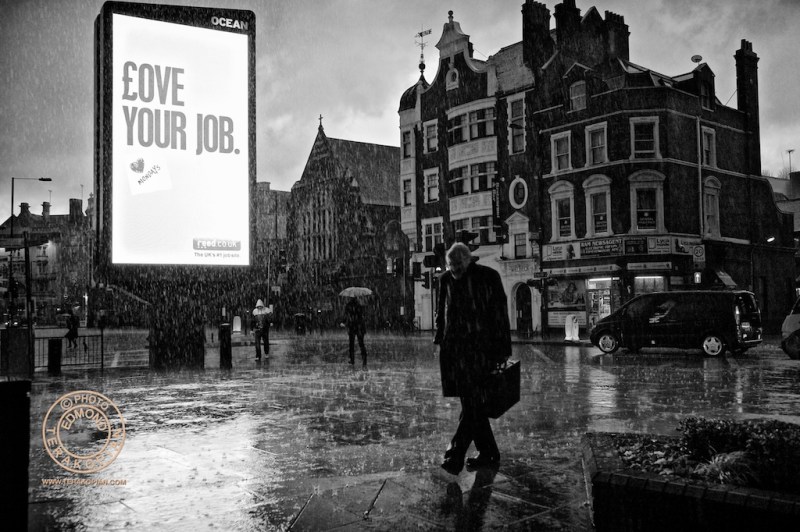 A heavy downpour of rain soaks pedestrians as they pass an illuminated advertising sign saying “Love Your Job”. Hammersmith, London. January 14, 2011. Photo: ©Edmond Terakopian