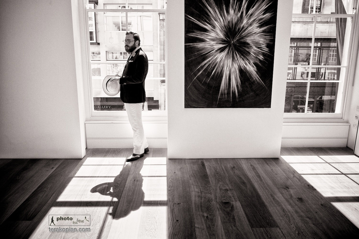 The Summer Saunter. A group of bold and independent men led by stylist Timothy Lord and The Chap Magazine’s Albion step out in style in the name of sartorial freedom, from the steps of St. Paul’s Cathedral to Mayfair’s Berkeley Square in a demonstration of solidarity with all men who dare to dress differently. London, UK. Toby Pennington at an exhibition by Agnieszka Brzeżańska, Marlborough Contemporary gallery, Albemarle Street, London, where the gentlemen stopped for a Champagne break. July 21, 2013. Photo: Edmond Terakopian July 21, 2013. Photo: ©Edmond Terakopian