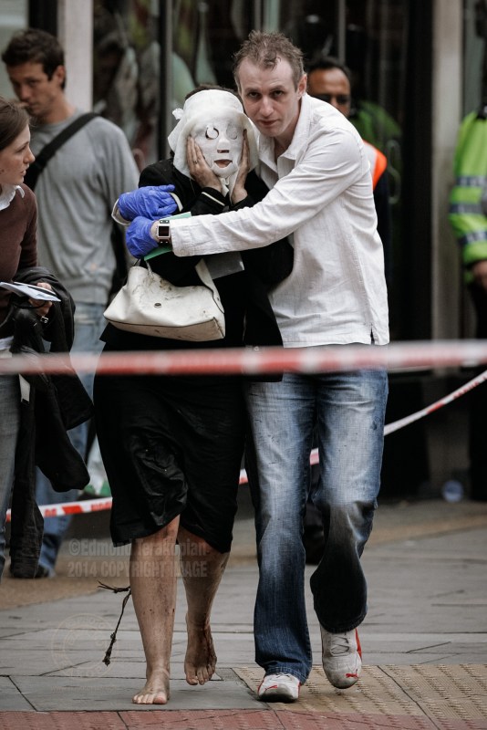 Paul Dadge leads Davinia Turrell (now Davinia Douglass) away from Edgware Road tube station after a suicide bomb attack in which she suffered burn injuries, resulting in the need for a face mask. The bomber blew himself up on a train at the station, killing seven passengers – one of four coordinated attacks on London’s public transport system during the morning rush hour. The bombs exploded within 50 seconds of each other on London Underground trains, and the fourth bomb occurred on a bus less than an hour later. The explosions resulted in some 56 deaths (including those of the four bombers) and 700 injuries. Surveillance video footage showed that the four men had been working together. Intelligence services have claimed links between the bombers and al-Qaeda. Edgware Road underground station, London, United Kingdom. July 07, 2005. Photo: Edmond Terakopian