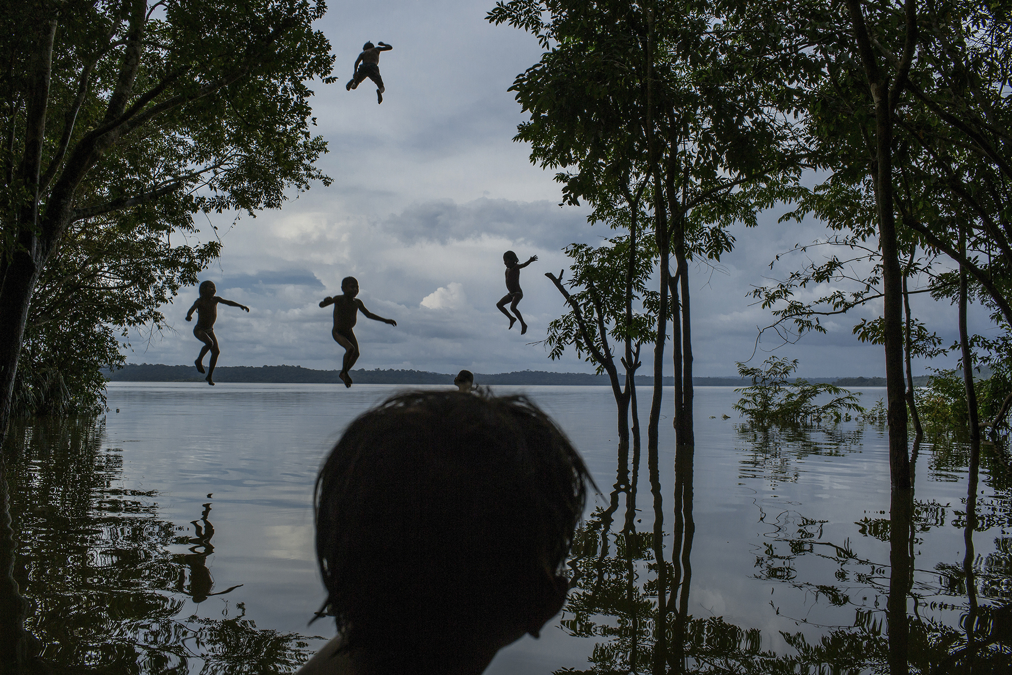 1. Tapajós River, Itaituba, Pará State, Brazil, on February 10, 2015. Indigenous children jump into the water as they play around the Tapajós river, in the Munduruku tribal area called Sawré Muybu.