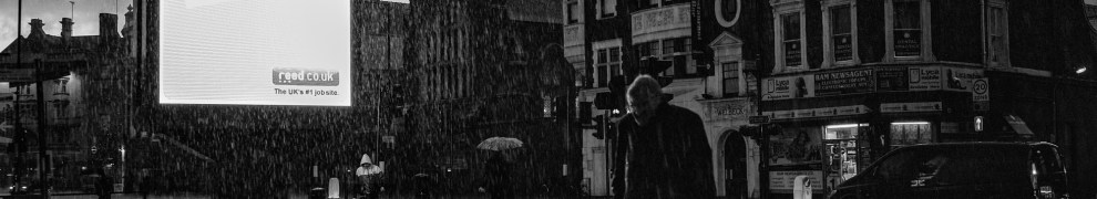 The image was made as I was running to the car park. As soon as I saw the light from the advertising hoarding, it made me stop. The way it was lighting the rain and the wet pavement caught my eye. It was only a moment later that I read the message. The problem though, was that the digital advertising was a constant slideshow. None of the other adverts were as bright or simple; they were in fact colourful and messy, and as a light source didn’t work as they were much dimmer.