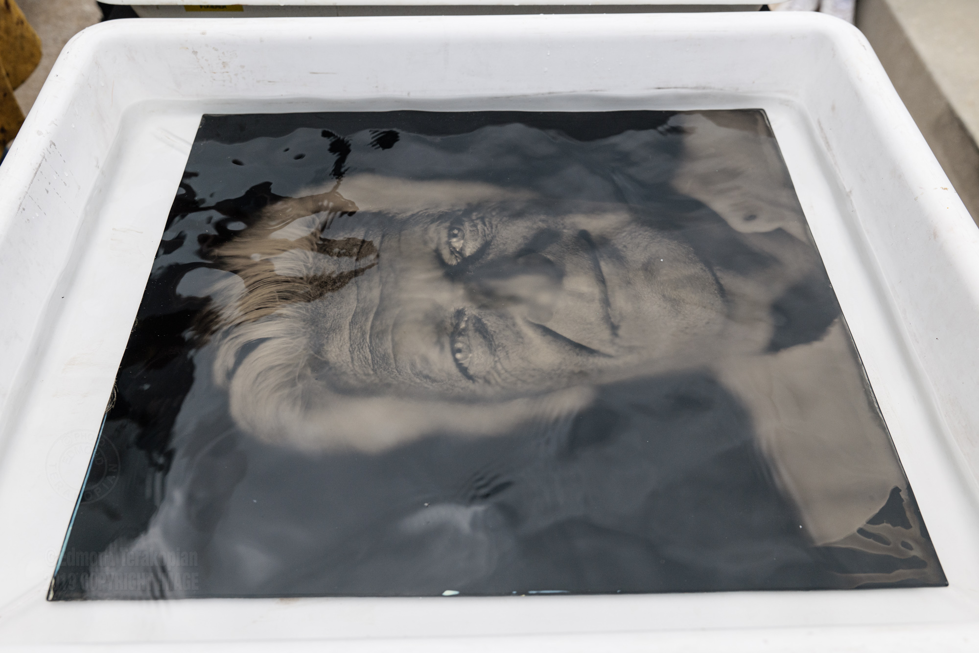 Photographer Kurt Moser finishes processing the ambrotype portrait of television presenter Max Moor, in a tray of fixer, outside his mobile darkroom. Inauguration of Lumen, the Museum of Mountain Photography, at 2275m, perched atop Mount Kronplatz-Plan de Corones, South Tyrolean Mountains and Dolomites, Italy. July 20, 2019. Photo: Edmond TerakopianPhotographer Kurt Moser finishes processing the ambrotype portrait of television presenter Max Moor, in a tray of fixer, outside his mobile darkroom. Inauguration of Lumen, the Museum of Mountain Photography, at 2275m, perched atop Mount Kronplatz-Plan de Corones, South Tyrolean Mountains and Dolomites, Italy. July 20, 2019. Photo: Edmond Terakopian