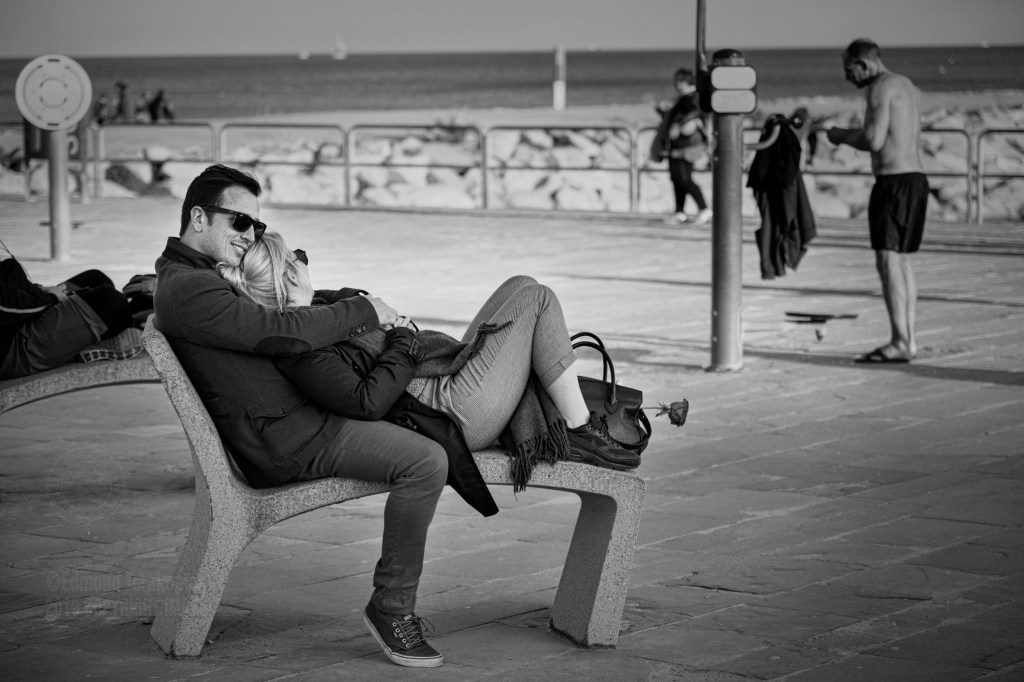 A couple embrace on the beach. Daily life, Barcelona, Spain. January 27, 2019. Photo: Edmond Terakopian *NB Test shot with a prototype Lumix S1*