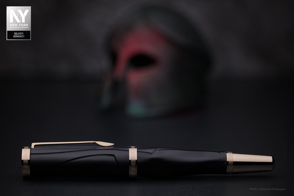 The groundbreaking Baetylus from Den’s Pens. It’s by far one of the most inventive, unique, creative and remarkable fountain pen designs. Custom made in black ebonite, with some facets polished and others in matte. Each Baetylus is even more unique, as each is entirely shaped by hand. The shape and feel, give it an organic presence, as if born from the earth. Photo: Edmond Terakopian. Lumix S1R and Sigma 105mm f2.8 Macro Art DG DN.