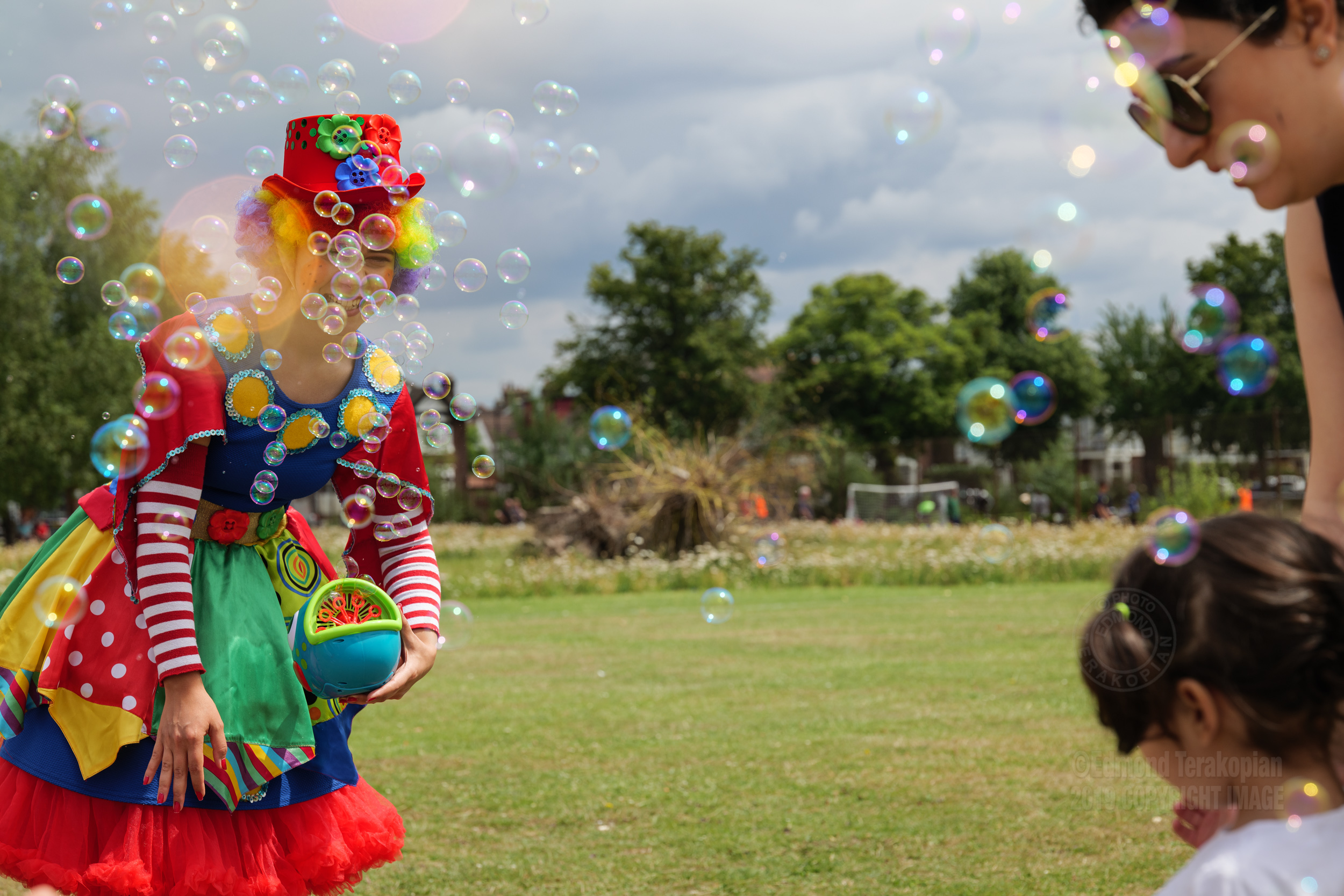 Entertainer and clown Christina Petre. Armenian Summer Festival, North Acton Playing Fields, Eastfields Road, London, UK. July 14, 2019. Photo: Edmond Terakopian ***Photo taken using a pre-production Lumix S 24-70mm f2.8 lens, running early firmware. This lens is not a final production sample*** COPYRIGHT PHOTO