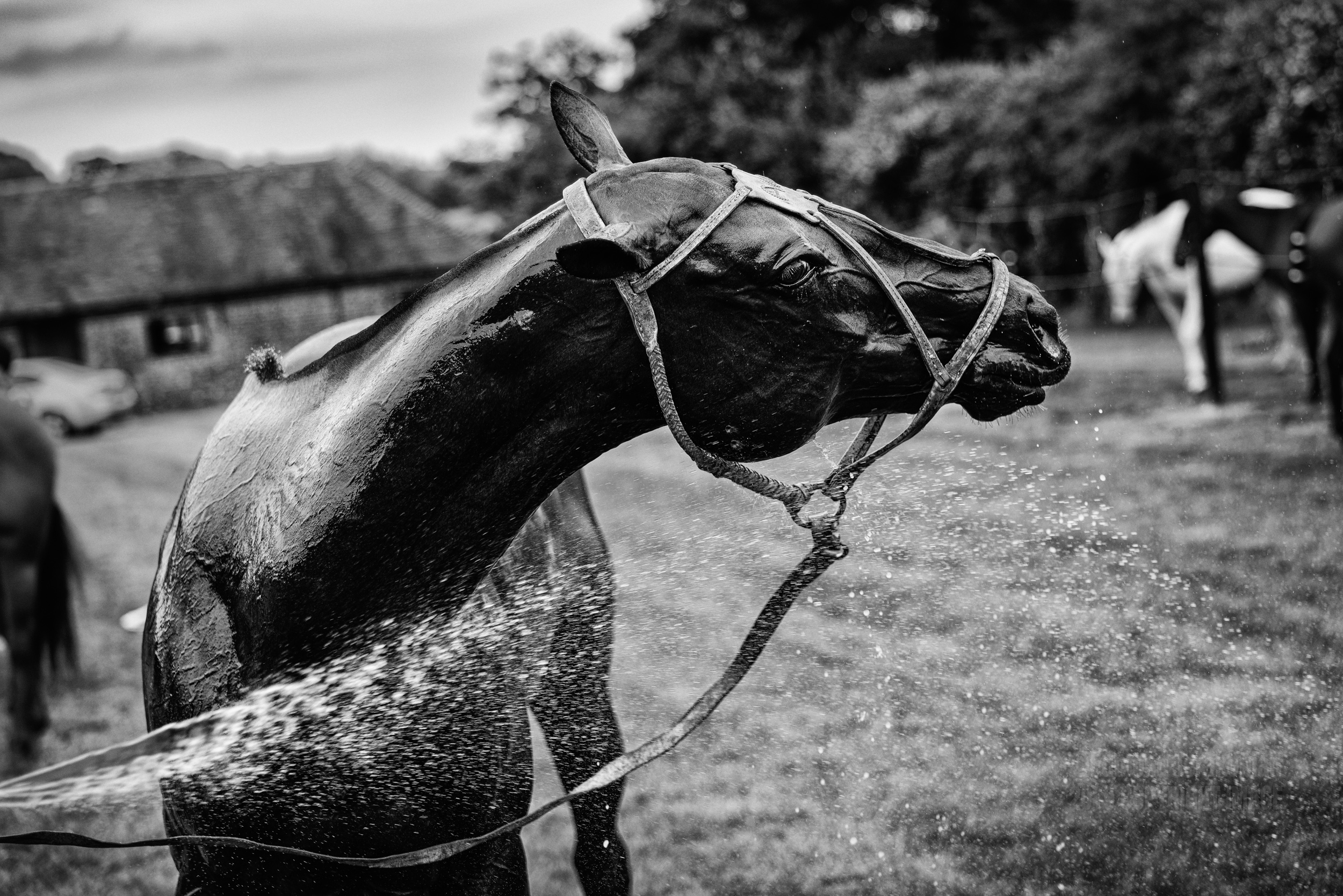 The horses are cooled down with water after the match. King Power Gold Cup polo match between Emlor and Murus Sanctus. Cowdray Park Polo Club, Ambersham & Brooks Field Grounds, Selham, West Sussex. July 10, 2019. Photo: Edmond Terakopian ***Photo taken using a pre-production Lumix S 24-70mm f2.8 lens, running early firmware. This lens is not a final production sample*** COPYRIGHT PHOTO