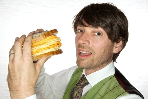 Alex James, bassist from Blur turned cheesemaker, is launching an exciting, innovative line exclusively with Asda entitled Alex James Presents.The range, on shelves from August 22nd, includes deliciously creamy cheddar blended with wonderful flavour combinations, such as Cheddar and Tomato Ketchup, Cheddar and Salad Cream and Cheddar and Tikka Masala. Alex with a huge sandwich filled with sliced cheeses from the new range. Photo: Edmond Terakopian