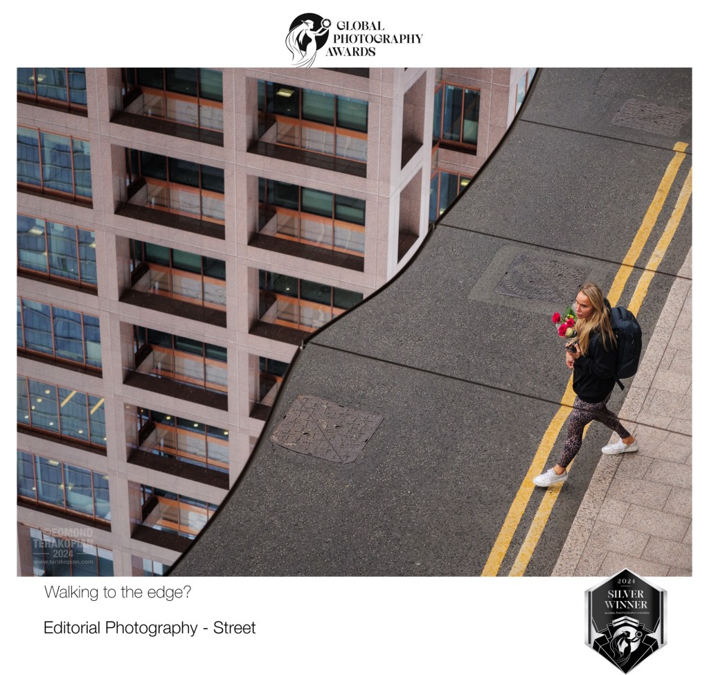 The Street photograph titled ‘Walking to the edge? ‘ was made on a Lumix G9 with a Lumix G 35-100mm f2.8 lens.