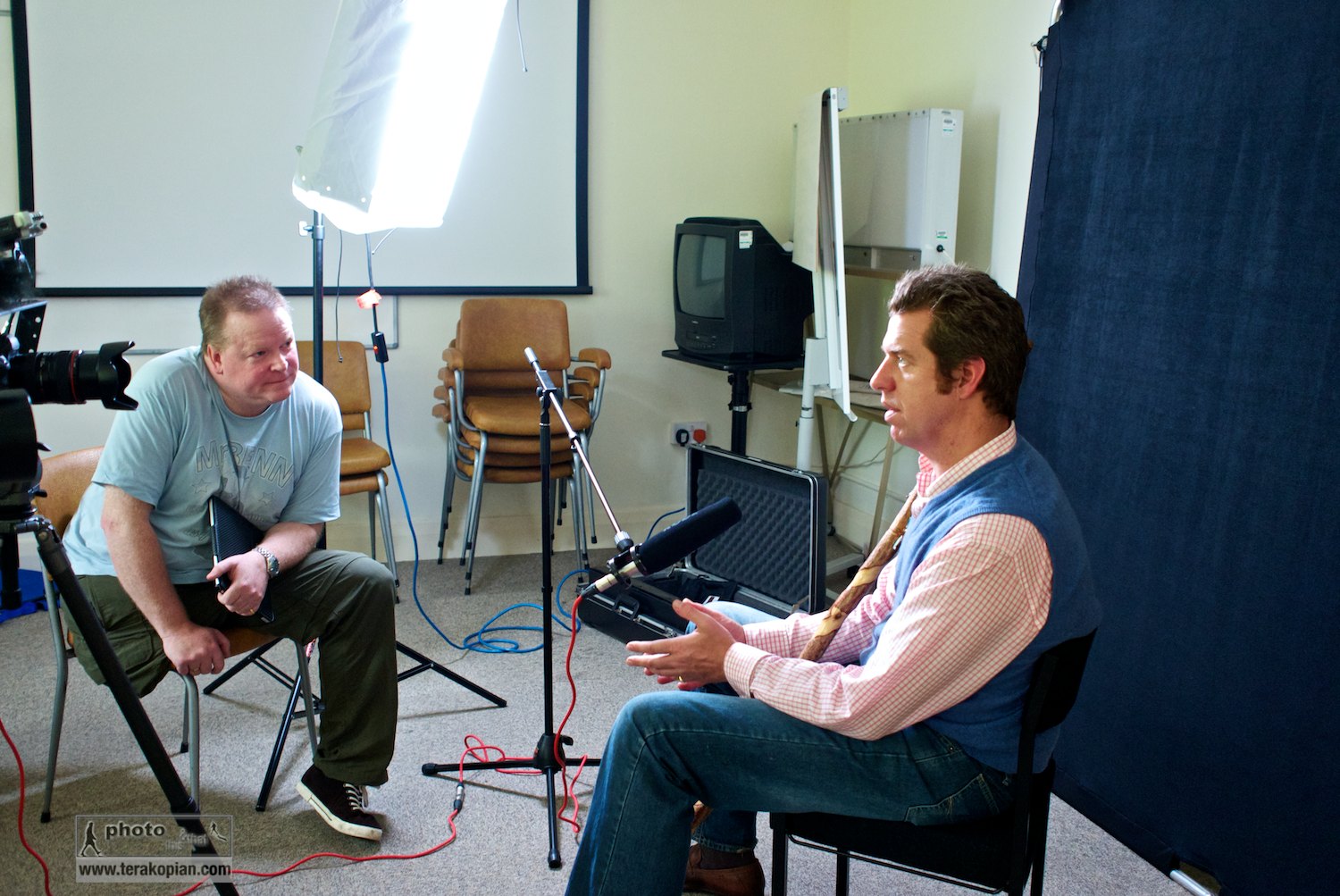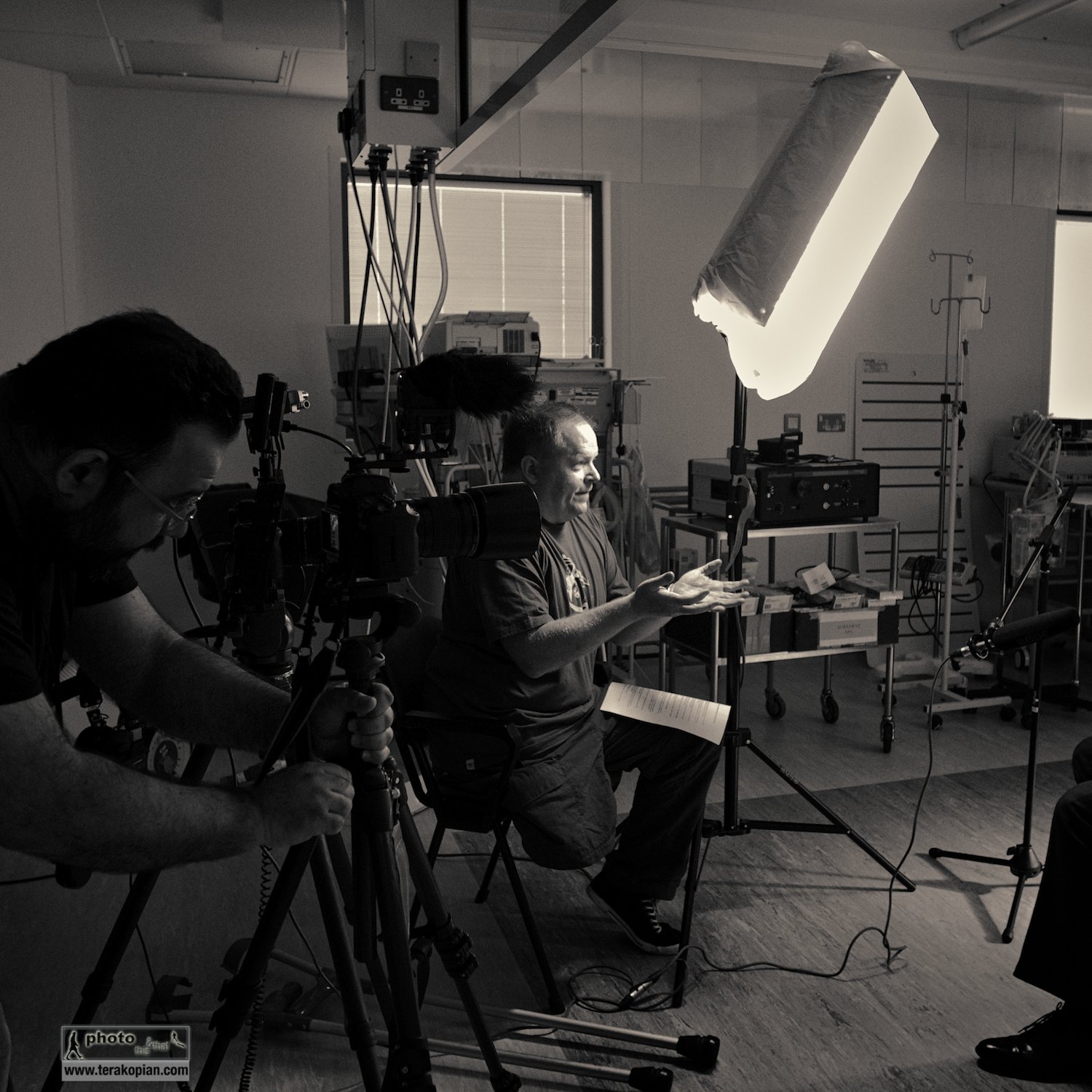 Behind the scenes photographs of the filming of the appeal film. Producer and editor Neil Patience and ex-patient Phil Packer. RNOH, Stanmore. Photo: Nicola Taylor